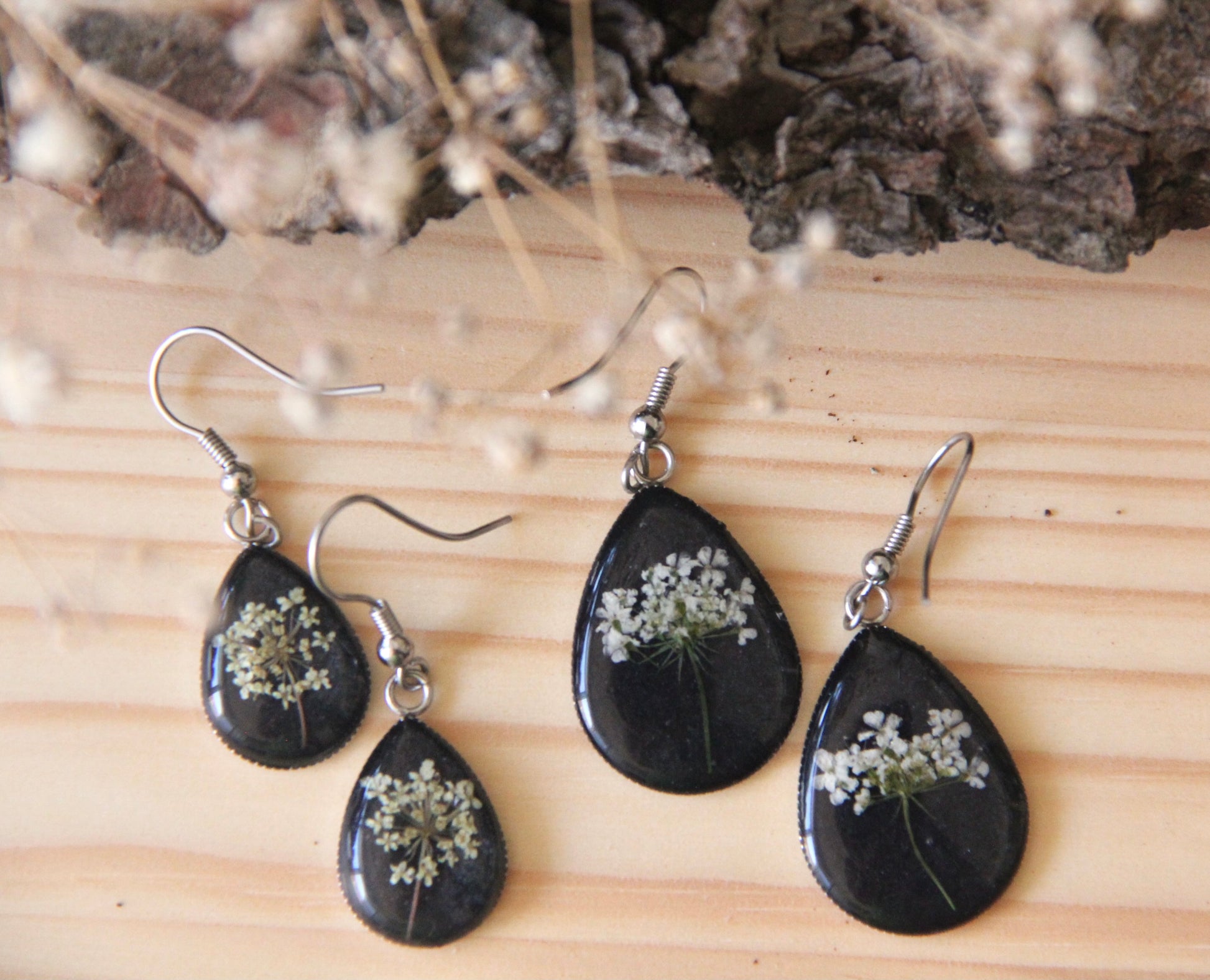 Hojas naturales de zanahoria silvestre prensadas una a una durante 3 a 5 semanas, encapsuladas en resina, y montadas sobre acero inoxidable antialérgico, para una joyería ligera, duradera y respetuosa con tu piel.