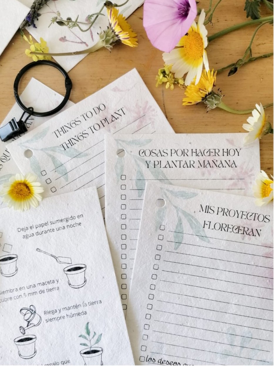 Hecha de papel reciclado repleto de semillas de lavanda, manzanilla, rudbekia, amapola, hierbabuena y margarita, esta libreta te acompaña en tu viaje hacia el éxito y la sostenibilidad.