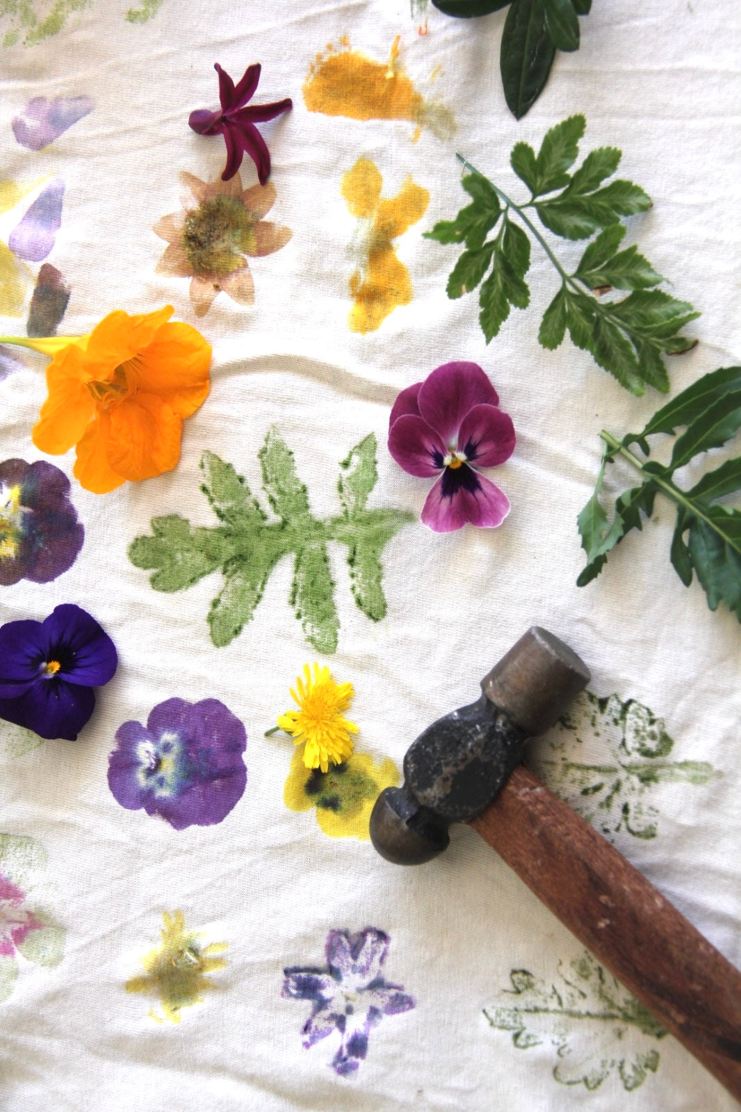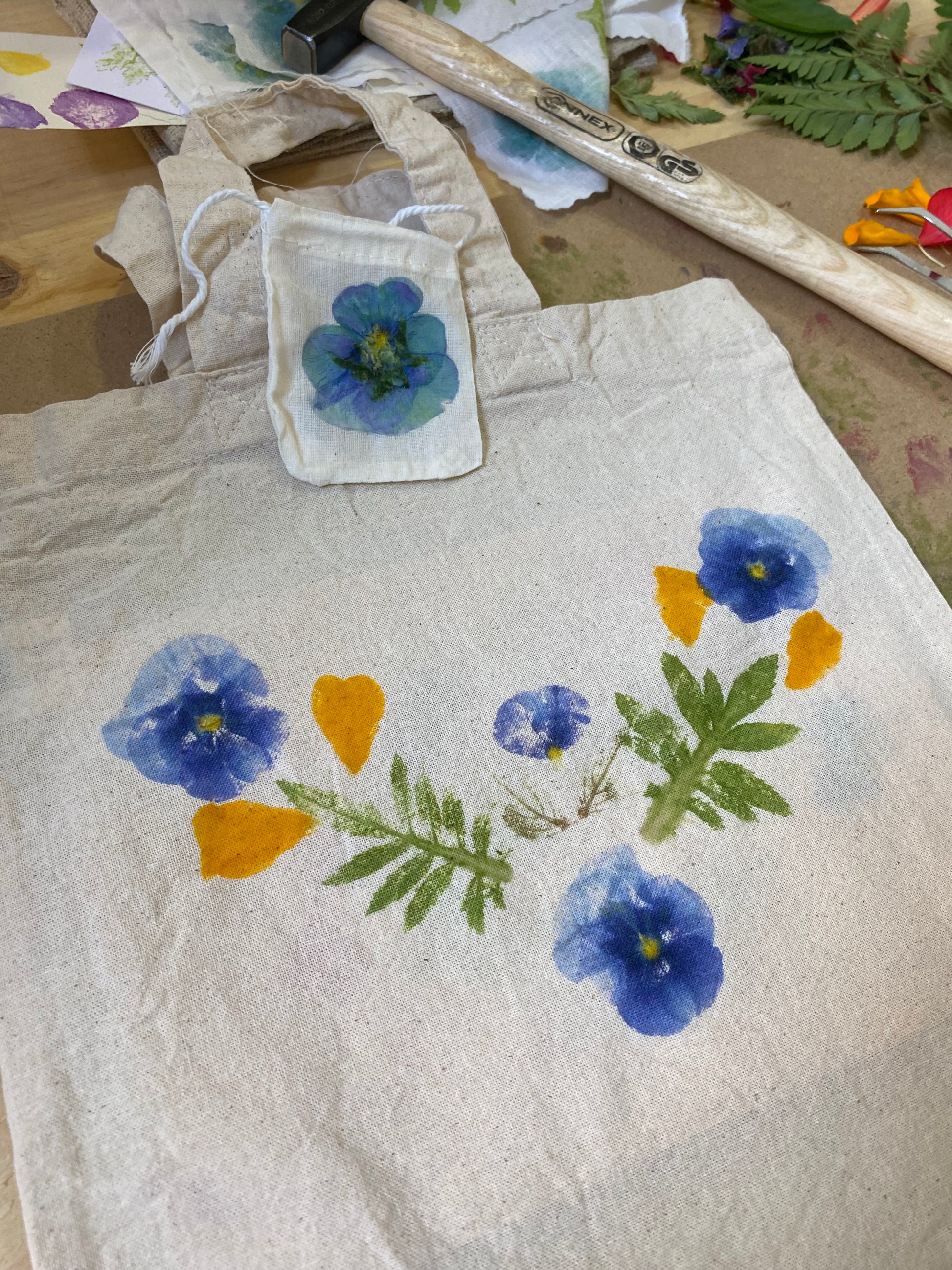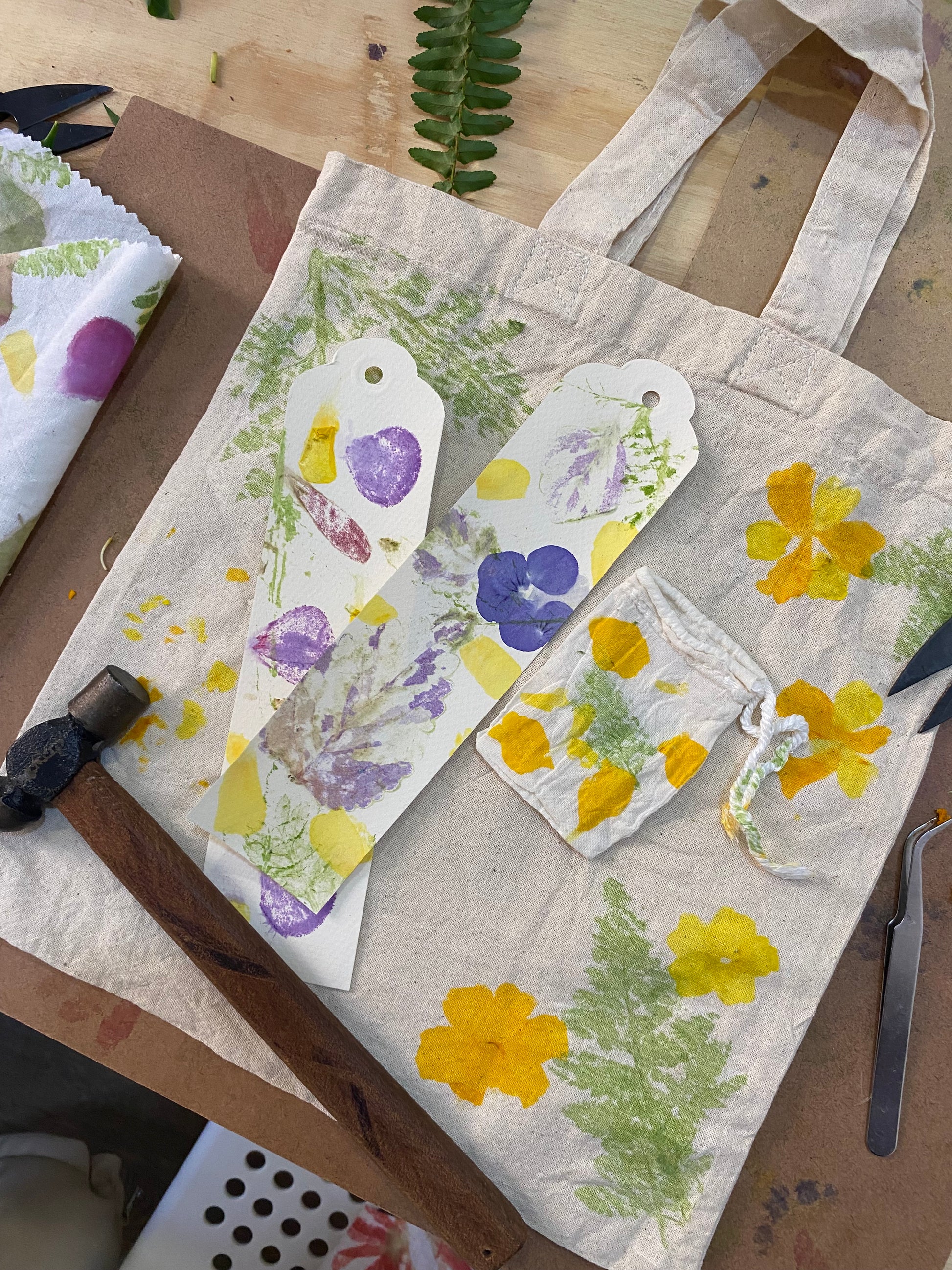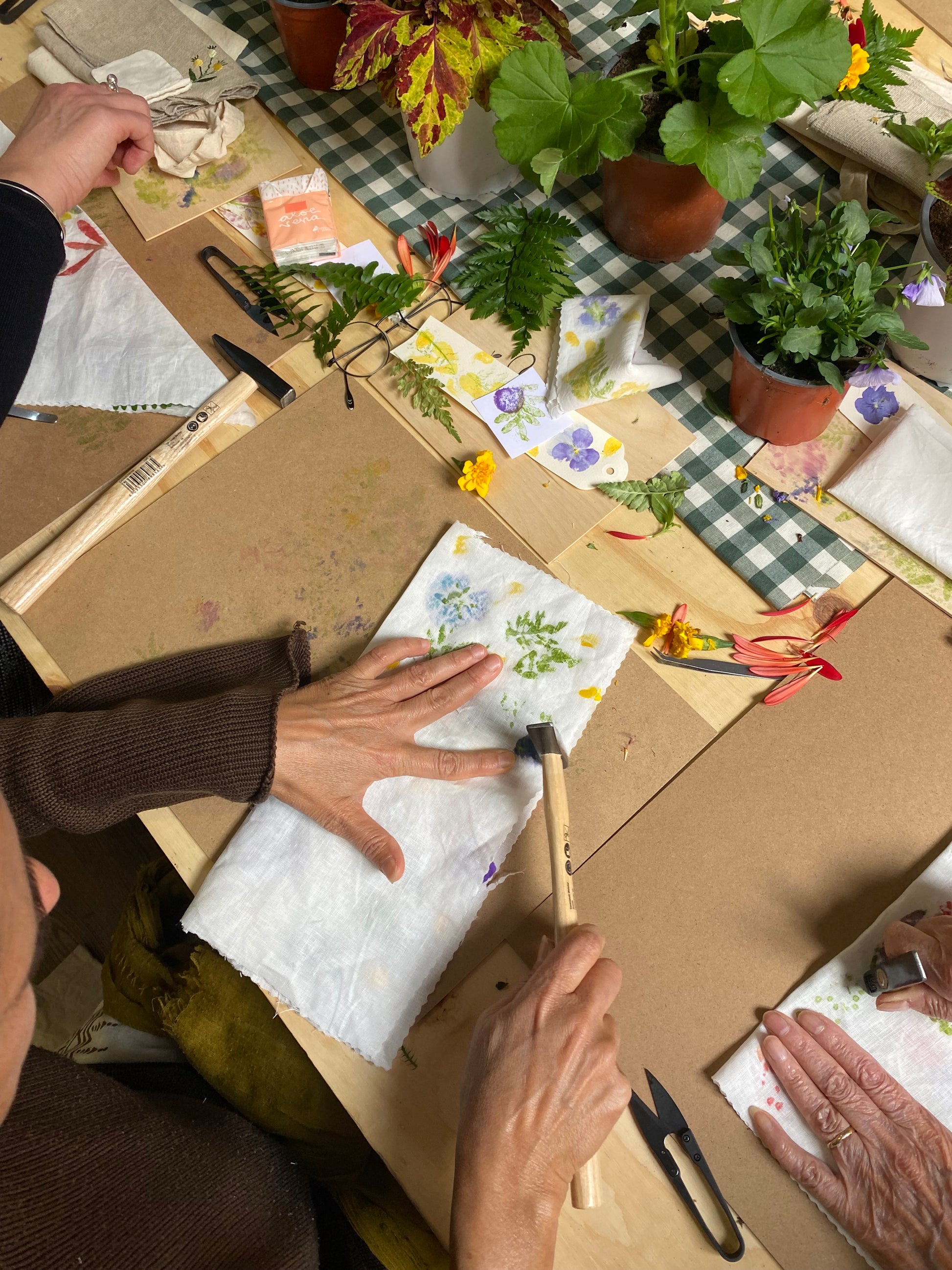 Taller de estampación botánica con la técnica japonesa Hapa Zome, donde a través del martilleadlo y presión sobre las flores y hojas estamparemos distintos soportes, dejando sus formas y colores para hacer diseños únicos.